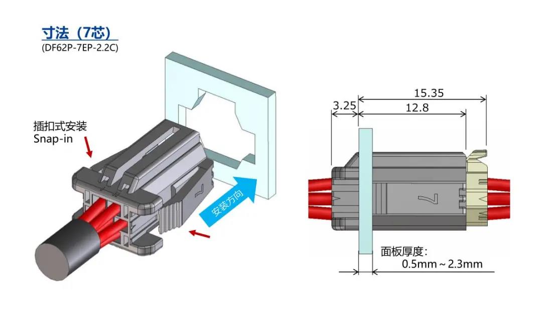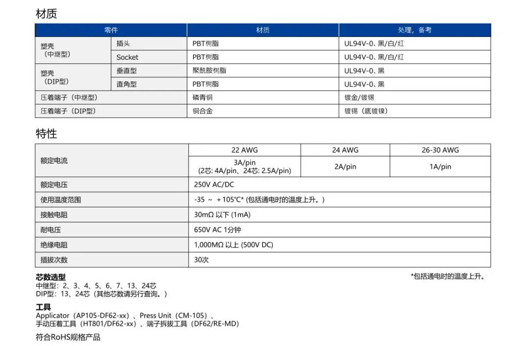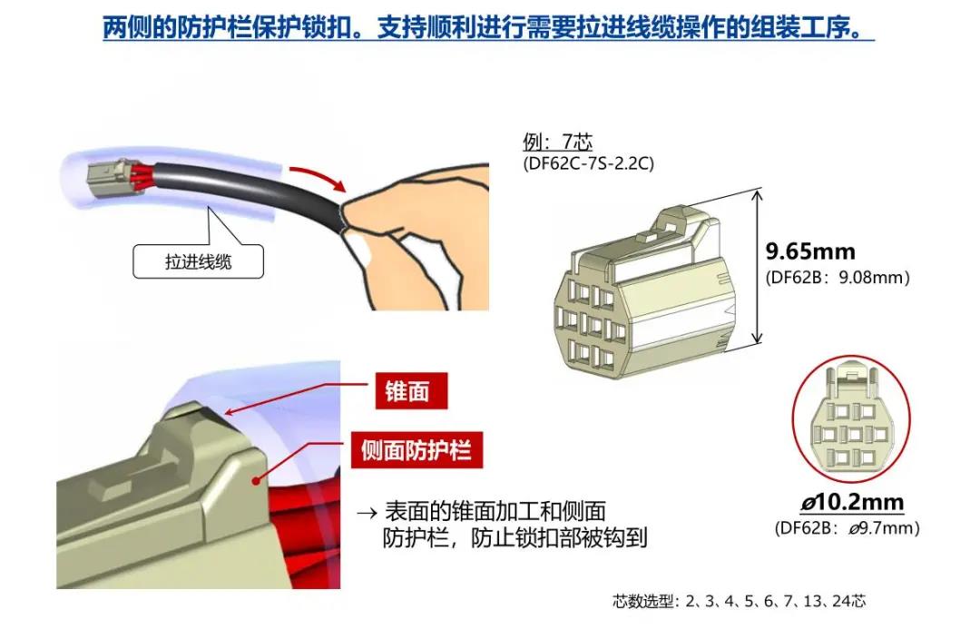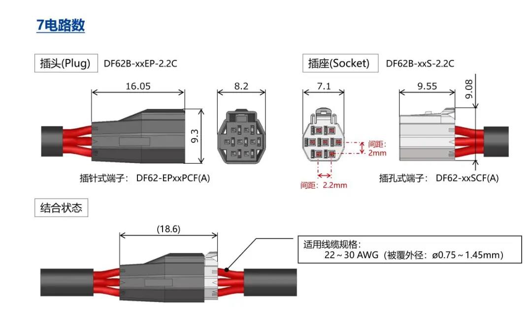 特点 [SignalBee™] 2 x 2.2 mm间距 用于狭小空间纤细型中继连接器(UL C-UL认证产品) 1. 纤细光滑的外形适合狭窄空间的布线 2. 清晰的锁扣感和目视可确认是否锁定 3. 可靠的接触结构 4. 坚固的端子结构 5. 芯数选型:2、3、4、5、6、7、13、24 DF62B:标准型 DF62C:锁加部保护强化型 DF62P:面板安装型 6. 可与DF11/DF59系列共用自动压着设备 7. 防冷凝措施(防水型DF62W) 细小